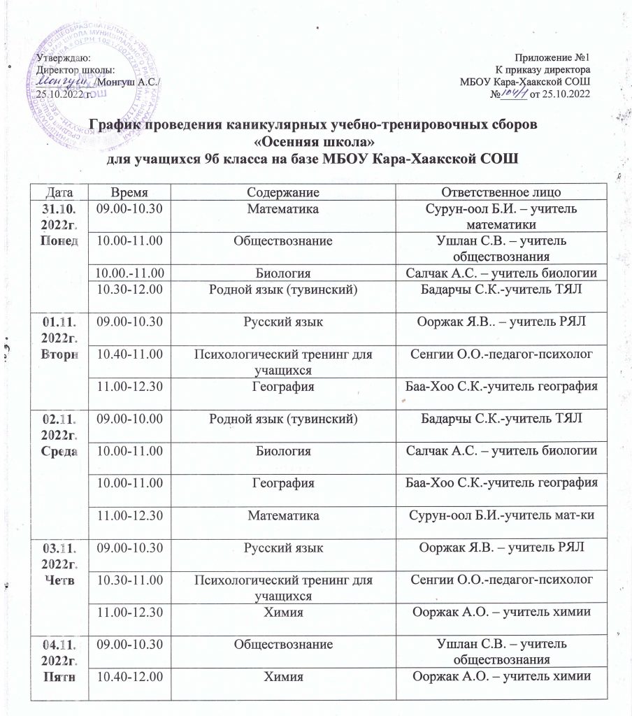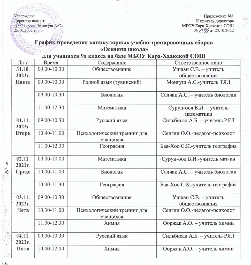 31 октября в школе начались каникулярные учебно-тренировочные сборы «Осенняя школа» для учащихся 9 и 11 классов. Проведены консультации по обществознанию, тувинскому языку, математике, биологии, русскому языку.