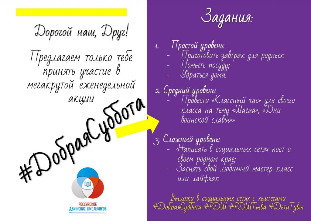 ПЛАН проведения Всероссийской акций «Добрая суббота», Воскресенье с семьей»  с участием обучающихся образовательных организаций Кызылского кожууна