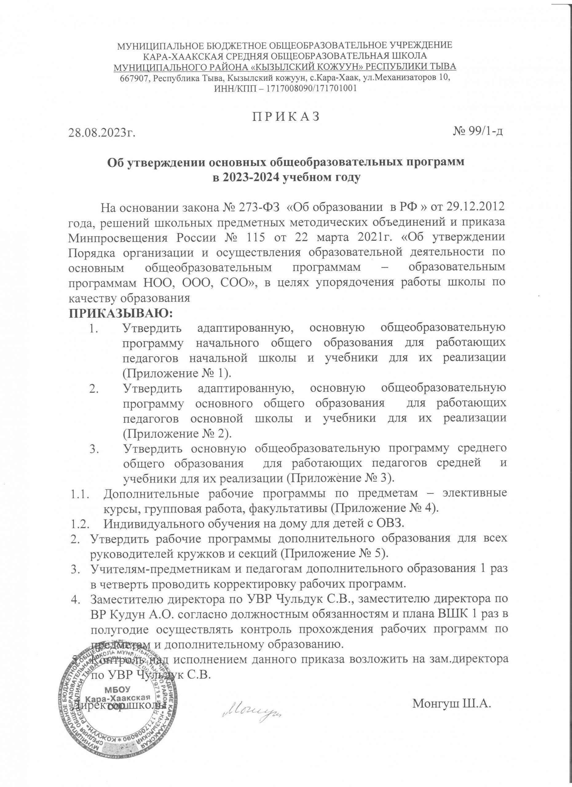Приказ Об утверждении основных общеобразовательных программ в 2023-2024 учебном году